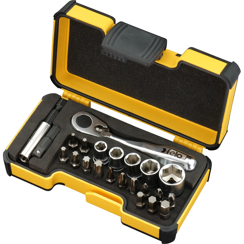 Набор бит и головок с трещоткой в кейсе Felo 05772306 содержит трещотку 60 зубьев, набор бит и метрических головок предназначен для проведения слесарных, ремонтных и монтажных работ с различного рода крепежом. Трещотка Felo имеет усиленный механизм, полностью выполнена из высококачественной инструментальной стали (CrMoV), закаленной в масле и имеет повышенный ресурс работы. Прямая фиксация бит в трещотке позволяет инструменту с легкостью работать в труднодоступных местах. Изогнутая на 15° ручка трещотки Felo защищает пальцы пользователя от механических повреждений при работе и позволяет работать в труднодоступных местах. Инструмент и оснастка поставляется в ударопрочном пластиковом кейсе, в котором будет удобно его хранить и транспортировать.