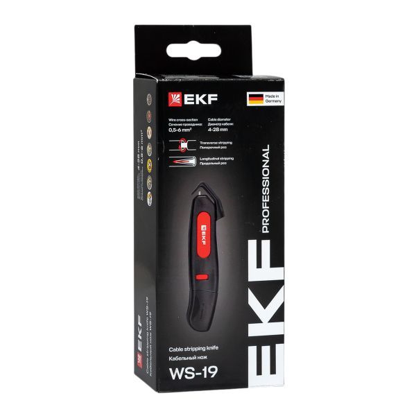 WS-19 кабельный нож с приспособлением для снятия изоляции всех распространенных круглых проводов и кабелей (тонкожильный и массивный кабель в ПВХ изоляции) от 4 до 28мм. Встроенная в корпус изделия функция снятия изоляции с гибких и жестких монтажных проводов поперечным сечением от 0,5 до 6мм.