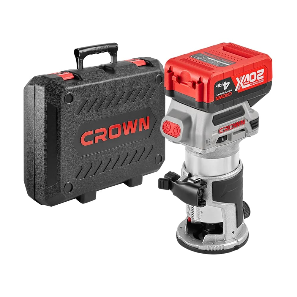 Аккумуляторный фрезер BL CROWN CT26010HX-4 BMC – инструмент для профессиональной обработки дерева, для мастеров, ценящих мобильность, производительность и удобство. В комплекте с двумя аккумуляторами по 4 Ач и быстрым зарядным устройством, этот фрезер готов к выполнению самых сложных задач без простоев. Фрезер по дереву CROWN CT26010HX-4 BMCсправится с широким спектром столярных работ, включая: Фрезерование по шаблону и обработку кромок. Врезку петель и выравнивание торцов полок. Обрезку свесов после оклейки и срезание заглушек. Художественную резьбу, инкрустацию и сверление отверстий. Резку материала и выполнение декоративных элементов. Ключевые особенности: Бесщеточный двигатель– обеспечивает высокую производительность, долговечность и энергоэффективность. Регулируемый рабочий ход фрезы до 20 мм– позволяет точно настроить глубину обработки для различных задач. Поддержка частоты вращения под нагрузкой– стабильная работа даже при интенсивных нагрузках. LED-подсветка рабочей зоны– освещает область обработки, повышая точность и комфорт при работе в условиях недостаточной освещенности. Мобильность– работа без привязки к розетке благодаря аккумуляторной платформе 20V Max. Плавный пуск Защита от перегрева/перегрузки Аккумуляторный фрезер BL CROWN CT26010HX совместим со всеми базами от сетевого кромочного фрезера CROWN CT11023S.