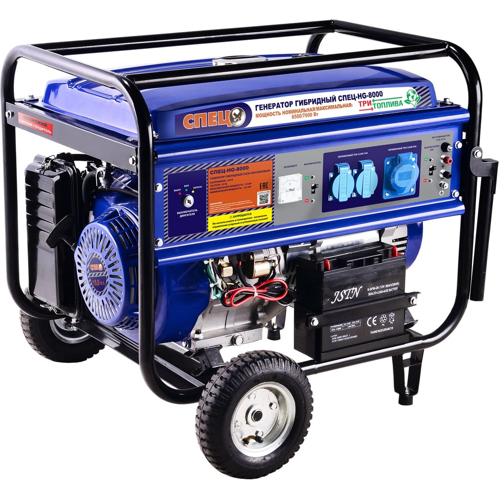 Гибридный генератор газ-бензин СПЕЦ HG-8000 и комплект для подключения к сети+баллону служит для снабжения бытовых приборов или строительного оборудования качественным электричеством. В качестве топлива используется не только бензин АИ-92 и сжиженный газ в баллонах (пропан-бутан), но и магистральный газ (метан). Все элементы установки крепятся на жесткую металлический раму, которая имеет ручки и колеса для удобства перемещения по рабочей площадке. Наличие клемм 12 В дает возможность подзарядки аккумуляторной батареи.