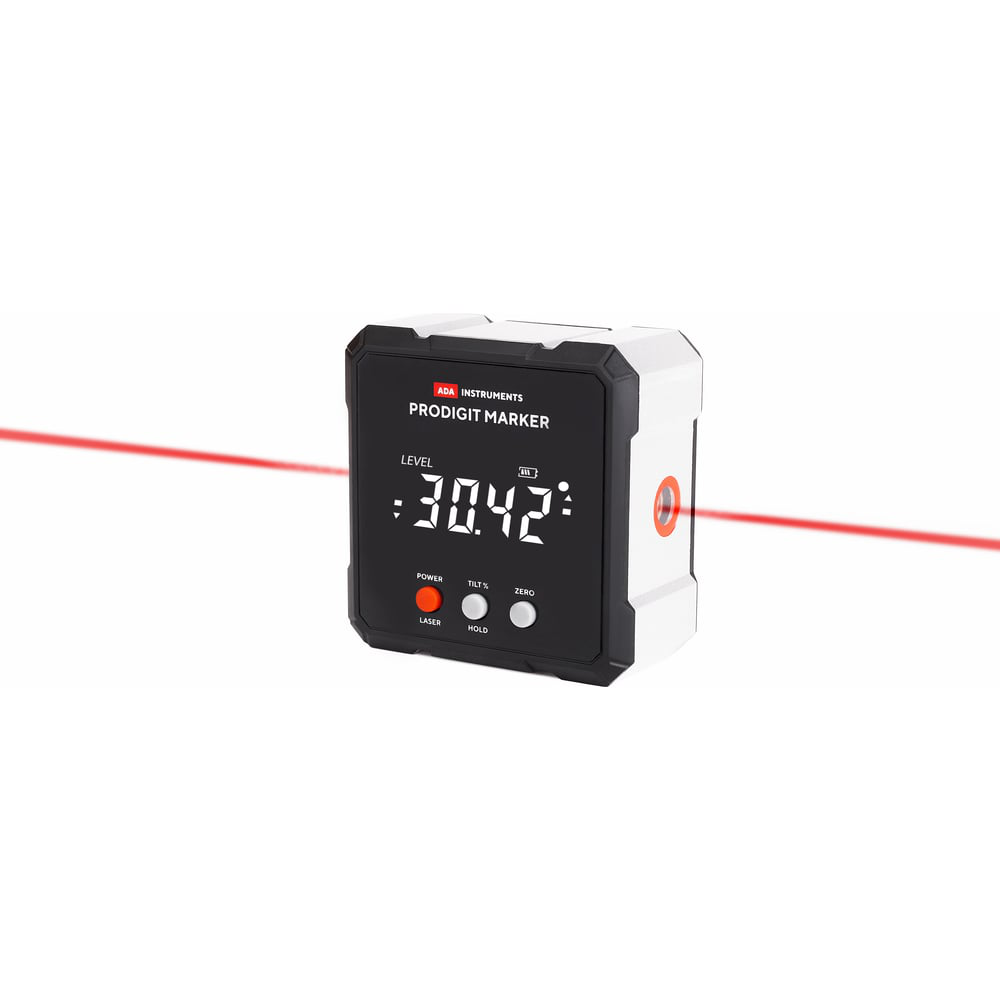 Электронный уровень с лазерным маркером ADA ProDigit MARKER А00671 позволяет быстро и точно определить угол отклонения поверхности от горизонта или вертикали. Лазерный маркер. Два встроенных лазерных луча визуально продлевают линию уровня. Удобно производить точную разметку на вертикальных плоскостях. Приложите уровень к стене и поворачивайте его на нужный угол, ориентируясь на показания дисплея. Лазерная линия покажет уклон на расстоянии от прибора. Легкое применение. Достаточно установить прибор на поверхность или прикрепить к вертикальной конструкции, и он покажет на дисплее не только угол отклонения, но и его «направление». Рабочая поверхность оснащена магнитами, что позволяет легко крепить и определять уклон стальных конструкций. Относительные углы. Для измерения относительных углов (между двумя произвольно выбранными поверхностями, например между рабочим столом и диском торцовочной пилы) есть специальный режим. Результаты можно выводить на дисплей в градусах и в %. Полученные измерения можно зафиксировать на экране. Контрастный дисплей. Дисплей оснащен подсветкой для работ в затемненных местах. Отображение результатов переворачиваются в зависимости от положения уровня для удобства считывания. Компактность. Корпус прибора выполнен из лёгкого и прочного пластика с алюминиевой рамкой. Благодаря малому весу и размерам он не займет много места. Литиевый аккумулятор. В качестве источника питания используется встроенный литиевый аккумулятор. Заряжать его можно от любого зарядного устройства для смартфона напряжением 5 В через разъем USB-C.