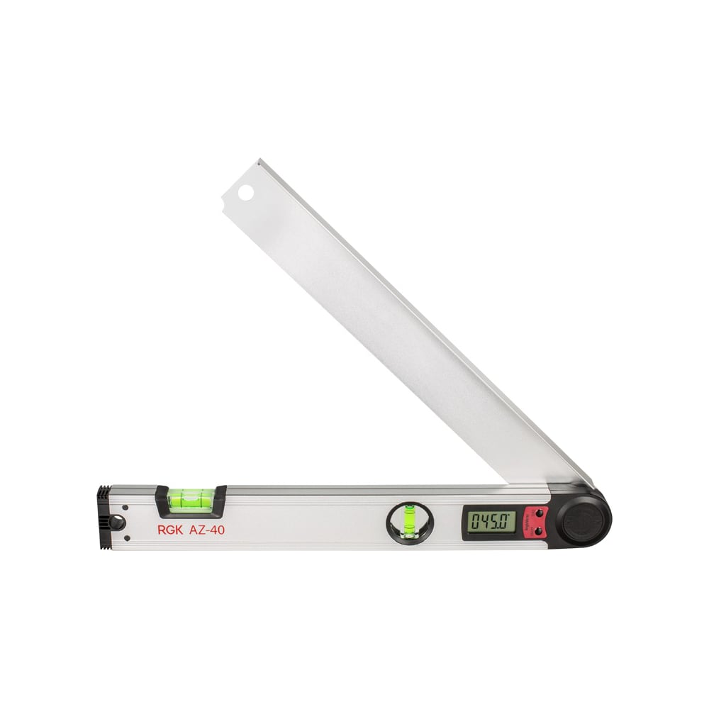 Угломер RGK AZ-40 используется для измерения углов. Горизонтальные и вертикальные пузырьковые уровни способствуют точному измерению углов. Автоматическое отключение прибора спустя пять минут бездействия экономит заряд батареи. Для простоты считывания информации все данные выводятся на дисплей.