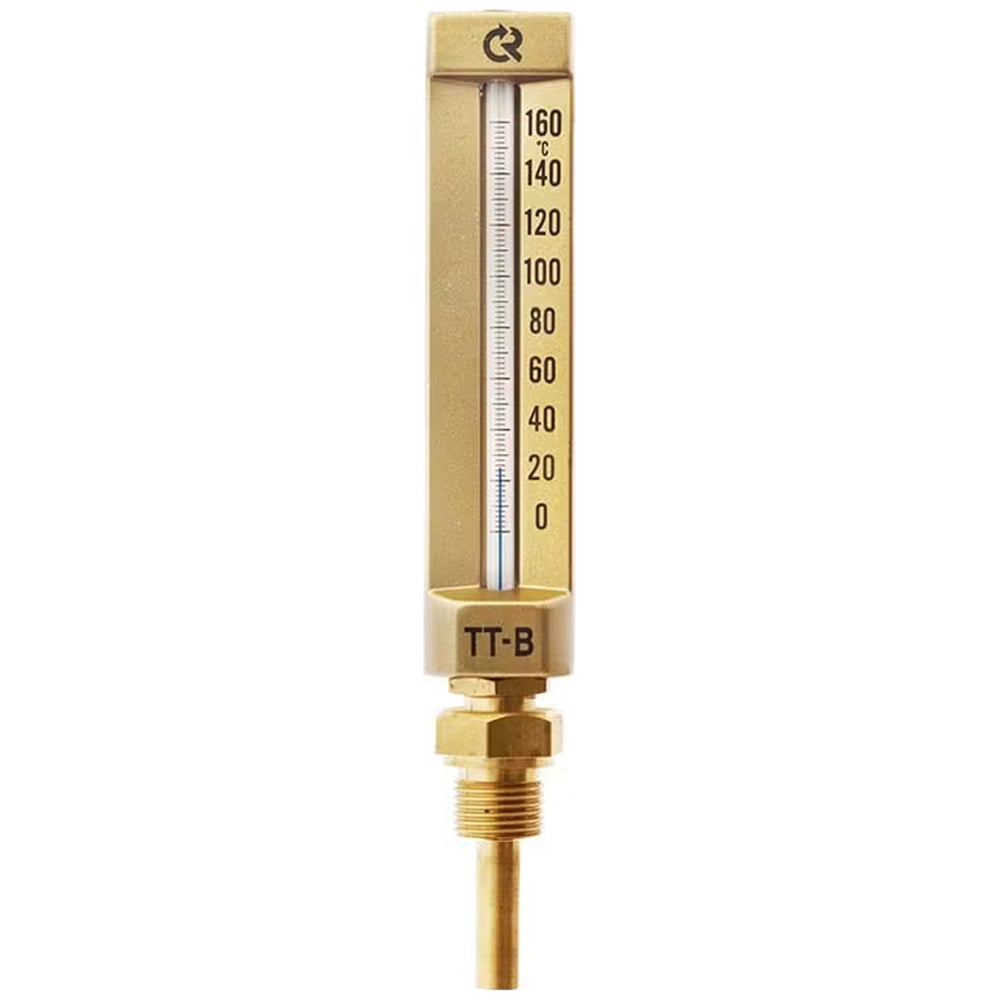 Термометр предназначен для измерения температуры неагрессивных жидких и газообразных сред в пределах от −30 до +200 °С. Прибор может использоваться в условиях высоких динамических нагрузок в различных отраслях промышленности. Прибор состоит из защищенной стеклянной оболочки капиллярной трубки с резервуаром, заполненным термометрической жидкостью, защитного корпуса и защитной гильзы. Шкала термометра нанесена на наружной поверхности капиллярной трубки. Верхняя часть капилляра (со шкалой) находится в корпусе, а нижняя (с резервуаром) — в гильзе. Корпус изготовлен из анодированного алюминия. Гильза изготавливается либо из латуни, либо из нержавеющей стали. По типу присоединения прибор может быть изготовлен в двух вариантах исполнения: термометр технический прямой и угловой. Основные характеристики: Область применения: судостроение, водоснабжение, теплоснабжение Корпус: анодированный алюминий Заполнение: термометрическая жидкость Материал гильзы: латунь Рабочее давление на гильзе: 10 МПа Межповерочный интервал: 3 года Климатическое исполнение: группа В3 по ГОСТ Р 52931, климатическое исполнение УХЛ категории 3.1 по ГОСТ 15150 Температура окружающей среды: от −40 до +60°C Товар может отличаться от представленного на фото, при выборе ориентируйтесь на технические характеристики.