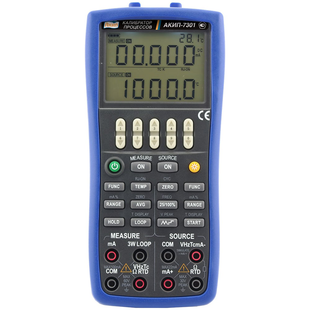 Многофункциональный калибратор процессов АКИП-7302 – это портативный, работающий от аккумулятора прибор с функцией формирования выходных электрических сигналов:ПОСТОЯННОЕ НАПРЯЖЕНИЕ -10 мВ...10 В, разрешение от 0,001 мВ, погрешность 0,02 % ИВ + 0,01 % ДПОСТОЯННЫЙ ТОК 0 - 22 мА, разрешение от 0,001 мА, погрешность 0,02 % ИВ + 0,02 % ДЧАСТОТА до 100 кГц, разрешение от 0,1 Гц, погрешность 2 ЕМРЧИСЛО ИМПУЛЬСОВ 10 - 10000 импульсов, разрешение 1 импульс. погрешность 2 импульсаУПРАВЛЕНИЕ ВНЕШНЕЙ ЧАСТОТОЙ (КЛЮЧ)СОПРОТИВЛЕНИЕ до 40 кОм, разрешение от 0,01 Ом, погрешность 0,02 % ИВ + 0,02 % ДФОРМИРОВАНИЕ СТАТИЧЕСКОЙ ХАРАКТЕРИСТИКИ (ТЕРМОЭДС) ТЕРМОПАРЫ R, S, K, E, J, T, N, B типаФОРМИРОВАНИЕ СТАТИЧЕСКОЙ ХАРАКТЕРИСТИКИ ТЕРМОСОПРОТИВЛЕНИЯ Pt100, Pt200, Pt500, Pt1000, Cu10, Cu50