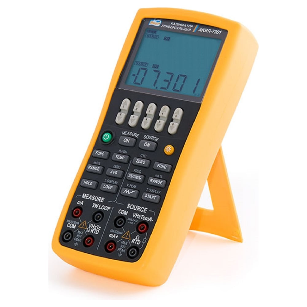 Калибратор промышленных процессов универсальный АКИП-7301 – это многофункциональное устройство, отличающееся простотой при использовании. Этот новейший, портативный, универсальный прибор позволяет тестировать и калибровать любые устройства в местах их установки. С его помощью можно моделировать и измерять напряжение, ток, частоту, давление, калибровать терморезисторы, термопары. В отличие от других устройств данной серии, этот прибор имеет режим имитации сигнала расходомера, а также проходного счетчика. Также устройство представлено с интуитивно понятным и удобным интерфейсом. Отличительные особенности: Он удобен при использовании (в работе не возникнет никаких сложностей даже у новичков) Прибор портативный, надёжный, долговечный Все элементы сделаны из прочных, современных и качественных материалов С ним можно быстро провести диагностику и проверку линейности различных параметров Наличие встроенной функции изменения с шагом 25 % Генерирование сигнала с автоматическим линейным изменением и шагом Прибор с широким функционалом С простым понятным интерфейсом Имеется дисплей (преобладает подсветка для удобства проведения исследований в условиях плохого света) Питание прибора – от четырёх батарей типа АА Прибор выполнен в удобном и красивом исполнении (для пользования достаточно поместить его в одной руке) Наличие съёмного полиуретанового кожуха (для защиты калибратора от повреждений) Рабочие температуры от 0 до 50 градусов Условия хранения от минус 10 до плюс 55 градусов