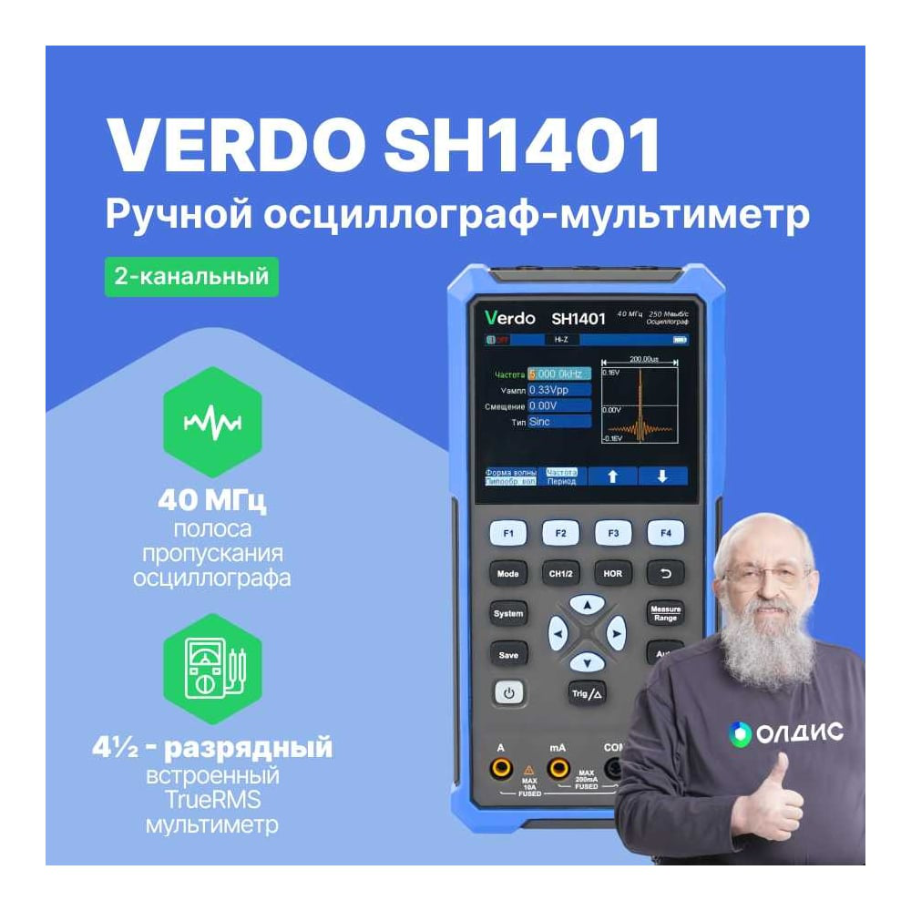 VERDO SH1401 - это портативный ручной осциллограф, который сочетает в себе функции двухканального цифрового осциллографа с полосой пропускания до 40 МГц и 4½-разрядного TrueRMS мультиметра. Этот прибор идеально подходит для организаций, формирующих комплект приборов для лицензии МЧС, а также для образовательных и обучающих целей. Особенности: Количество каналов - 2 Частота дискретизации - 250 Мвыб/сек Общий объем памяти - 8К Полоса пропускания - 40 МГц Максимальная частота захвата, осц/с - 10000 Вертикальная развертка - 10 мВ/дел - 10 В/дел Горизонтальная развертка - 5нс/дел – 1000с/дел Точность временной развертки, ppm - ±100 Режимы входа - DC, AC Частотомер - 4 ½ разрядов, от 2 Гц до макс. полосы пропускания Дисплей - 3,5" цветной ЖК-дисплей, 320 × 240, 65536 цветов, TFT экран Интерфейс - USB интерфейс