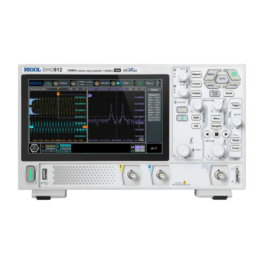 Осциллограф серии DHO812 — это совершенно новый 2-х канальный, экономичный и компактный цифровой осциллограф высокого разрешения с полосой пропускания 100 МГц.Изделие имеет максимальную частоту дискретизации 1,25 Гвыб/с, скорость захвата до 1 000 000 осц/с (режим Ultra Acquire), максимальную память хранения до 25 млн. точек, высокое разрешение по вертикали 12 бит и низкий уровень собственного шума.В базовой комплектации осциллографа уже предусмотрены функции анализатора спектра, встроенного частотомера, счетчика, вольтметра и анализатора сигналов протоколов последовательных шин. Наличие разъема питания USB Type-C позволяет использовать прибор как от стандартного сетевого адаптера, так и от внешнего power bank, что делает его пригодным для измерений в полевых условиях.Осциллограф RIGOL DHO812 объединяет в себе пять независимых приборов в одном:Цифровой осциллографАнализатор спектра3-битный цифровой вольтметр6-разрядный высокоточный частотомер и 48-битный сумматорАнализатор протоколов