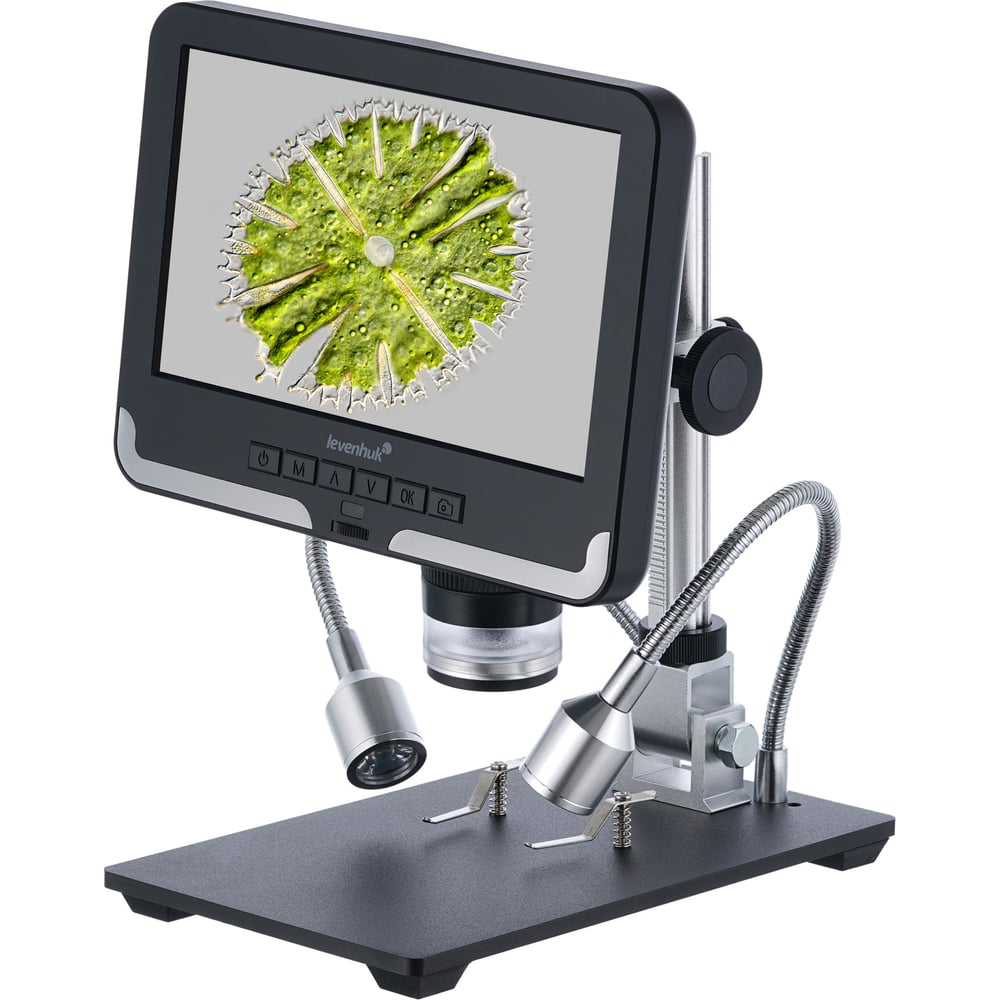 Микроскоп с дистанционным управлением Levenhuk DTX RC2 76822 – незаменимый увеличительный прибор для работы в ремонтной мастерской или сервисном центре. Он будет удобен при диагностировании поломок в механизмах и электроплатах, оценке ювелирных изделий, изучении сварных швов и припоя. Также он позволяет делать фотографии и записывать видео. Диагональ встроенного ЖК-экрана составляет 7 дюймов – это около 18 см. Такой размер обеспечивает хороший обзор и позволяет рассматривать протяженные области с максимальным комфортом. Экран можно наклонять, что также удобно при длительных наблюдениях. Картинка выводится в цвете и с хорошей детализацией. Для исследований можно использовать оптическое или цифровое увеличение. Общий диапазон кратности составляет от 3 до 200 крат. Также его можно использовать для создания фото- и видеоархивов, причем качество снимков будет очень высоким. Для фотографий можно выбрать разрешение до 12 Мпикс, для видео – Full HD. Запись ведется на карту памяти (не входит в комплект поставки). Подсветка состоит из нескольких элементов. Часть светодиодов находится внутри объектива. Также есть два отдельных светодиода, которые закреплены на гибких держателях. Такое расположение источников освещения позволяет наиболее точно направить свет. Яркость подсветки можно регулировать. Для удобства кнопки регулировки яркости вынесены на небольшой переключатель, расположенный на кабеле питания. Здесь же находится и кнопка включения/выключения прибора. Кнопки управления микроскопом размещены на передней панели под ЖК-экраном, но также они продублированы на беспроводной пульт. Он позволяет регулировать увеличение, настраивать яркость подсветки, работать с фото и видео и многое другое.