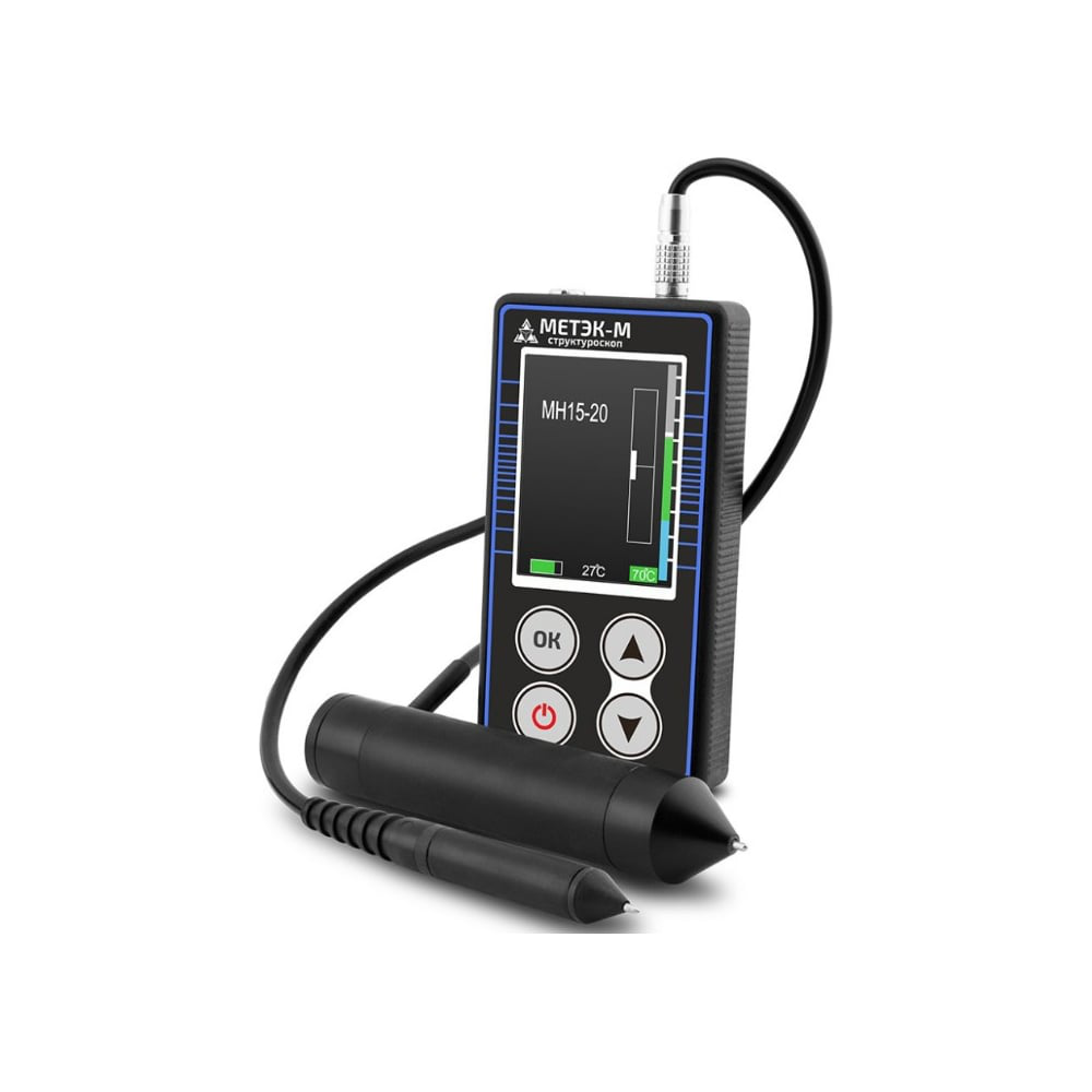 Структуроскоп МЕТЭК-М отображает термоЭДС в микровольтах. Имеет модернизированное ПО: отображение марки металла или сплава вместо цифр термоЭДС. Напряжение питания от сети переменного тока220 В,50 Гц Потребляемая мощность, не более7,5 Вт Готовность к работе, не более2 мин Время анализа одного образца, не более6 сек Локальность контролируемого участка0,5 мм Температура горячего электрода, не менее40 град Температура горячего электрода, не более90 град Время непрерывной работы от аккумулятора, не менее2 ч Габаритные размеры130 х 66 х 24мм Масса без блока питания0,25 кг