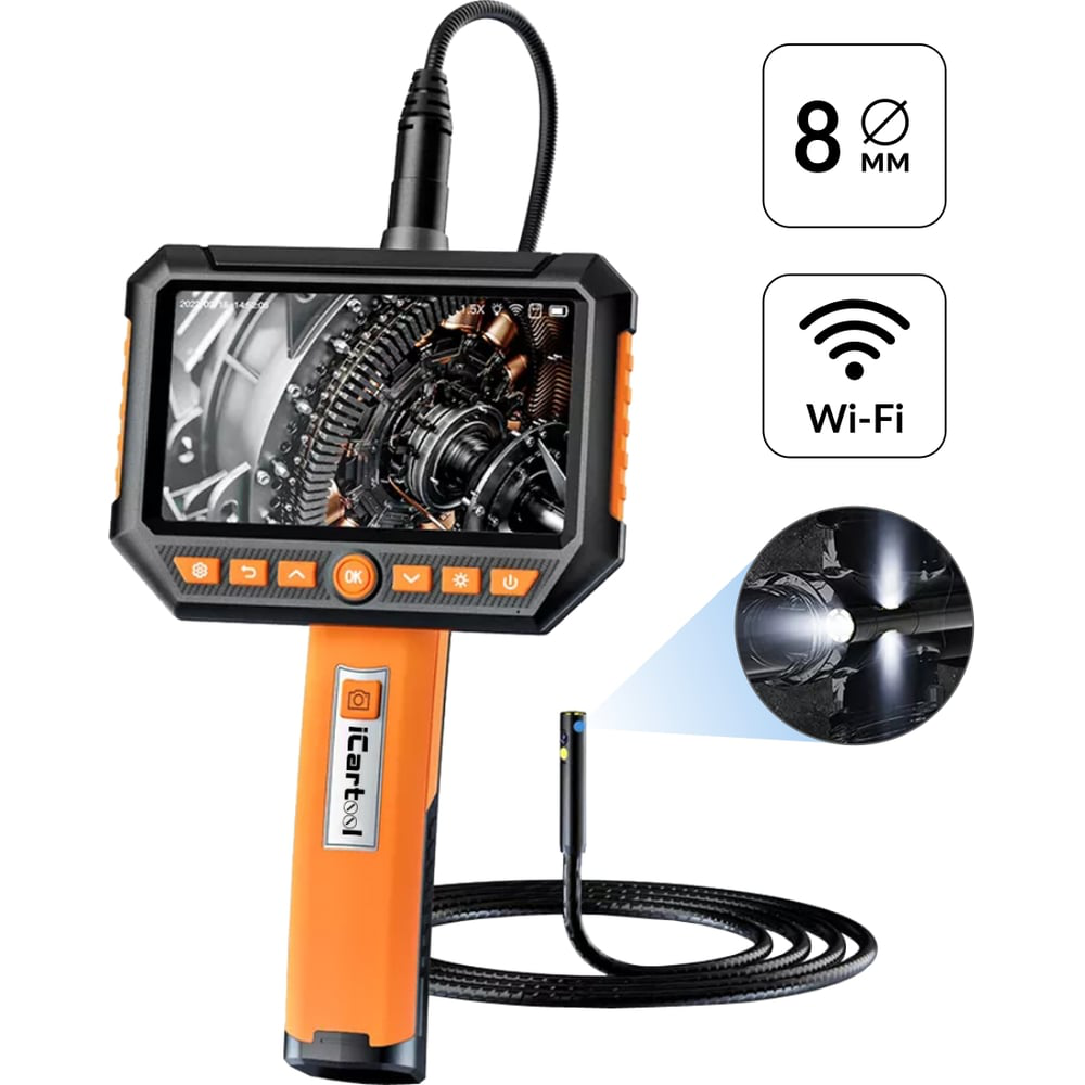 Промышленный видеоэндоскоп iCartool IC-V116A - новый вид эндоскопа, который оснащен сразу 3 видеокамерами, большим информативным дисплеем, модулем Wi-Fi и микрофоном. Экран с диагональю 5" и матрицей IPS имеет удобный интерфейс и воспроизводит изображения в разрешении HD. Две боковые камеры ориентированы на 90° относительно торцевой и в общей сложности дают обзор в 220°. Наличие боковых камер дает возможность отказаться от использования эндоскопов c дорогостоящими управляемыми зондами. Переключение между камерами, а также использование дополнительных функций происходит с помощью кнопочной панели управления. Зонд эндоскопа полужесткий, с эффектом памяти формы, имеет длину 1 м и диаметр 8 мм. Предусмотрена возможность подбора и замены зонда для различных задач. Видеоэндоскоп позволяет производить аудиозапись и транслировать процесс съемки на устройства с ОС iOS/Android посредством Wi-Fi соединения. Регулируемая LED подсветка обеспечивает возможность детального осмотра объекта. Особенности: Цветной IPS экран 5” с разрешением HD 3 камеры: 1 фронтальная и 2 боковых Разрешение фото и видео Full HD LED подсветка из 8 светодиодов с 3 режимами яркости Встроенный Wi-Fi модуль для одновременной демонстрации процесса съемки на мобильное устройство Встроенный микрофон и динамик Фонарик с настройкой угла освещения Поддержка карт памяти до 128 ГБ Литий-ионный аккумулятор емкостью 4400 мАч