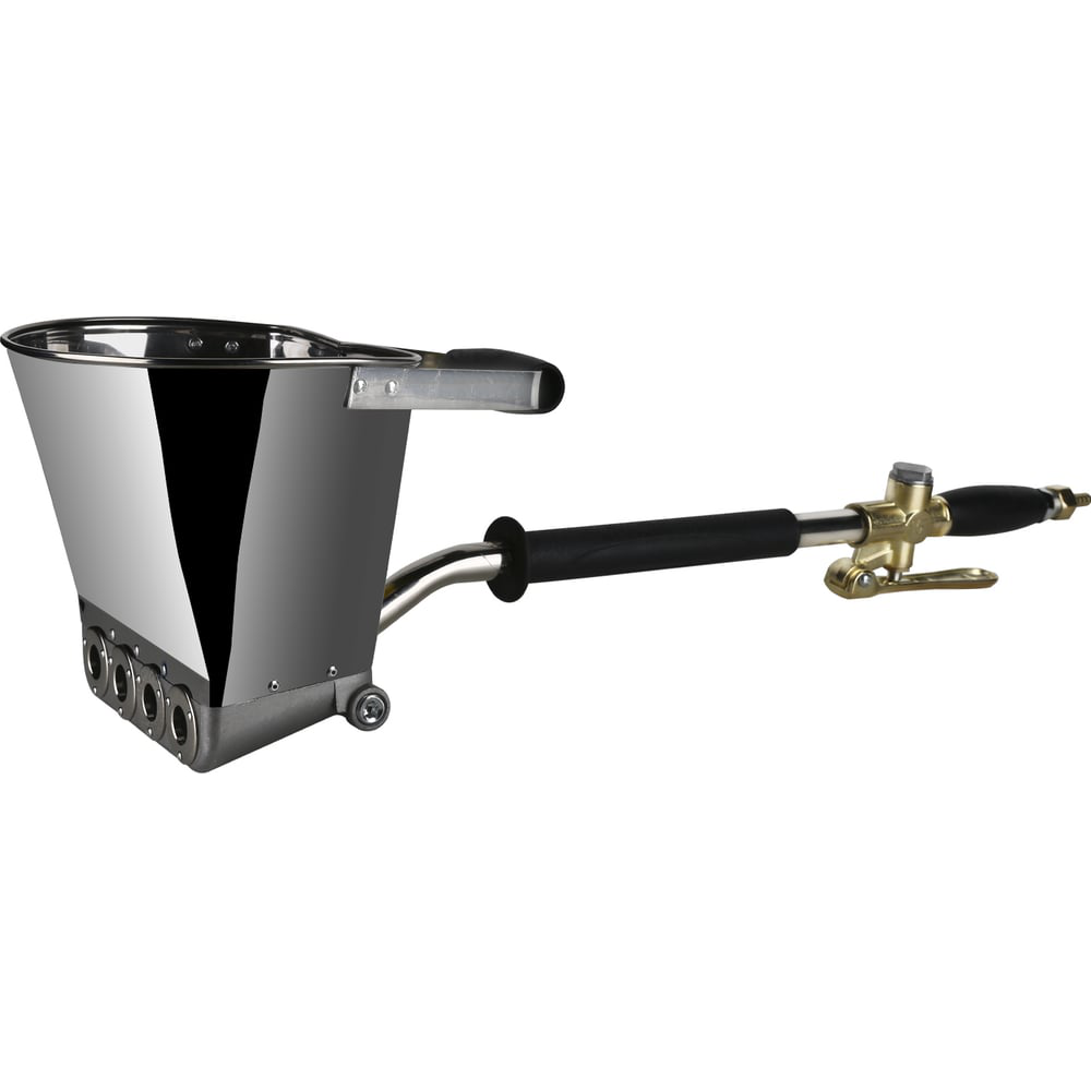 Штукатурный хоппер ковш Zitrek SN-01 используется для отделки вертикальных, наклонных и горизонтальных поверхностей строительными смесями. Он может работать с жидкими, цементными, известковыми, гипсовыми и клеевыми растворами, а также красками. Использование штукатурного ковша позволяет обработать 50 м.кв/час, при этом, добиться существенной экономии смеси за счет разбрызгивания под давлением. Преимущества использования оборудования Простота использования. Персоналу не нужно получать специальное образование, чтобы работать с ковшом. Высокая скорость работы. Время работы сокращается в 3-4 раза. Качественное нанесение. Благодаря работе под давлением улучшается сцепление смеси с поверхностью. Диаметр сопел позволяет использовать любые добавки. Ковш оснащен удобной рукоятью, которая позволяет обрабатывать поверхности в узких проемах и коридорах. Технические характеристики: Объем чаши - 3,5л Материал чаши - нержавеющая сталь Рабочее давление - 4-6 атм Производительность: 30-50кв.м/час Разъем подключения - нарезная резьба 1/2"