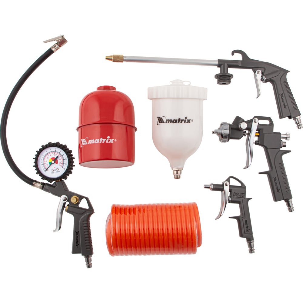 Набор пневмоинструмента MATRIX 57304 содержит 5 предметов. Он используется при покрасочных, промывочных и продувочных операциях, а также при подкачивании шин. Набор пригодится для работы в гараже, домашней мастерской, автосервисе, на мебельном производстве и при мелких посадочных работах. Подходит для всех видов пневматических компрессоров.