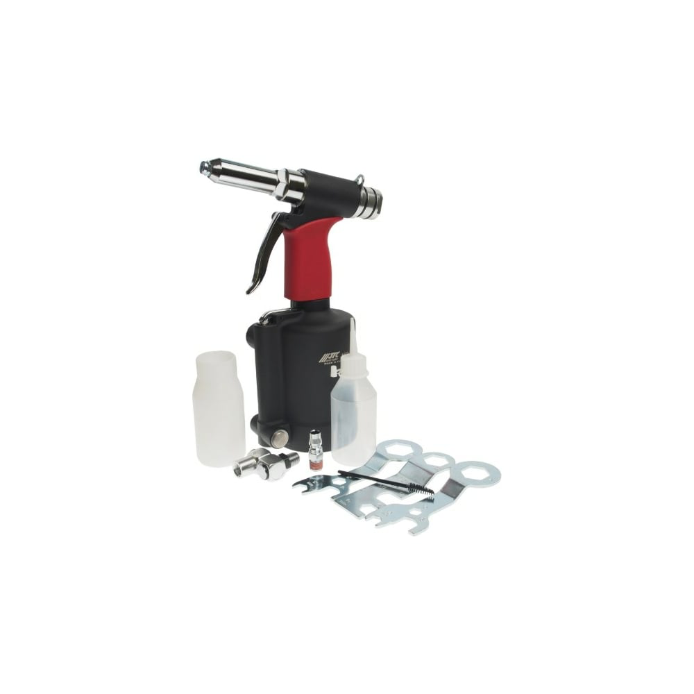 Пневматический заклепочник JTC 7728 подходит для установки вытяжных заклепок. Используется в сфере автомобильной и авиационной промышленности. Шток - 15.8 мм. Прочный корпус надежно защищает внутренние элементы от механических повреждений. Конструкция инструмента оснащена гасителем ударов, что снимает усталость рук в процессе работы. Длинную широкую клавишу пуска удобно нажимать при любом хвате рукоятки.