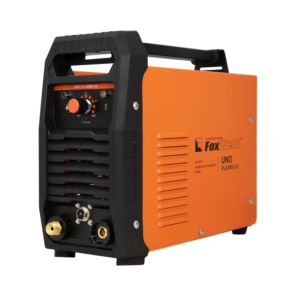 Аппарат плазменной резки FOXWELD UNO PLASMA 50 7254 - простой и надёжный аппарат плазменной резки для всех сортов сталей, алюминиевых и медных сплавов. Максимальная толщина резки стали - 18 мм, толщина чистого реза - 12 мм. Работает с напряжением от 180 до 270 Вольт. Максимальный ток нагрузки на питающую сеть - 22 А. Полная мощность равна 5 кВА или 3,8 кВт. Выполнен по инверторной технологии с современными IGBT транзисторами. Поджиг дуги контактный, в конструктивной схеме устройства есть осциллятор, дежурная дуга в плазмотроне не формируется. Время продувки - до 80 сек, после завершения процесса резки значительно повышает ресурс плазмотрона РТ-31. В корпусе плазмореза встроен узел подготовки воздуха с манометром на боковой стороне аппарата. Аппарат может работать как от электросети, так и от генератора переменного тока. При выборе мощности генератора необходимо прибавить к максимальной мощности плазмореза (3,8 кВт.) потребляемую мощность компрессора, т.к. аппарат не может работать без сжатого воздуха от компрессора. К примеру, к Foxweld UNO PLASMA 50 можно рекомендовать компрессор AEROMAX 380/100 HP, который имеет номинальную мощность 2,2 кВт (пусковые токи равны 3,1 кВт), следовательно, генератор должен быть мощностью не 8 кВт. Можно наполнить ресивер компрессора сжатым воздухом, выключить компрессор и начать процесс резки металла.