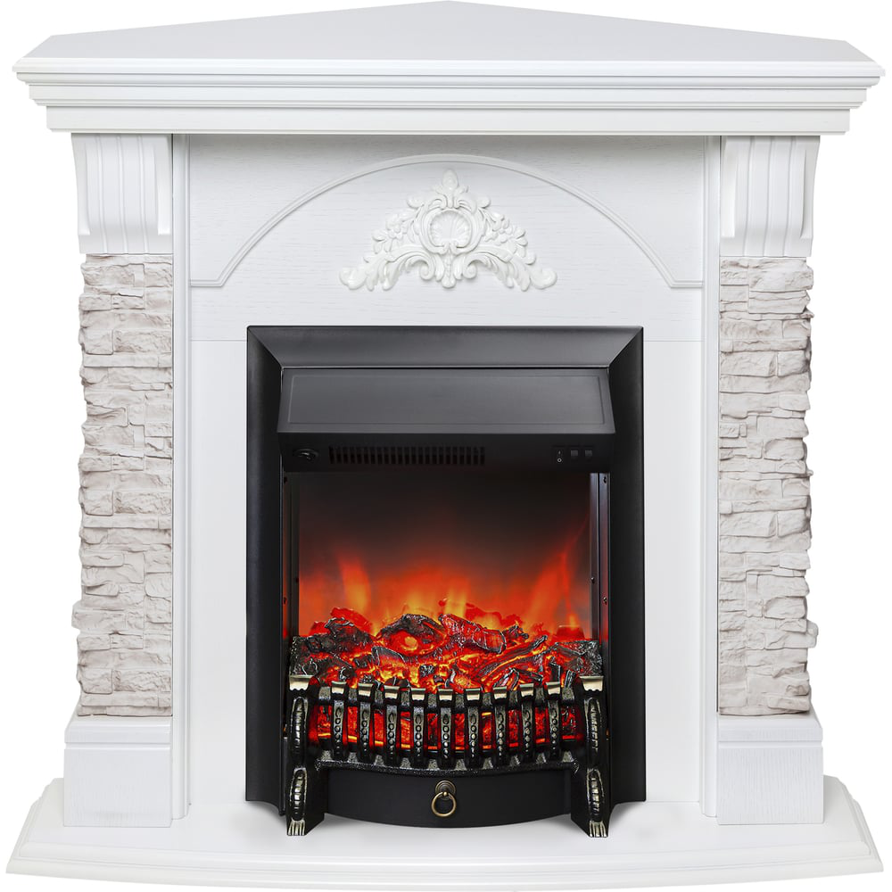 Угловой каминокомплект RealFlame Athena corner gr std wt + Fobos BL 10016087 сочетает в себе строгость и утонченность, роскошь и сдержанность. Декорированные искусственным камнем колонны, обрамляющие топку по бокам, переходят в плавно изогнутые капители, поддерживающие вместительную столешницу. Камин по бокам украшают скалистые колонны светло-серого оттенка, которые прекрасно сочетаются с праздничным белоснежным тоном портала. Предметы интерьера белого цвета всегда создают в помещении дополнительный уют. Светлые оттенки расслабляют, из-за чего в комнате приятно находиться, хорошо отдыхать. Оригинальность дизайна очага Fobos BL достигается литой чугунной решеткой, имитирующей колосник и внешней рамкой с небольшим капором. Благодаря задней зеркальной стенке создается эффект объемного пламени и дополнительной игры света и тени. Звук потрескивающих дров и наличие обогрева усиливает сходство с настоящим очагом. Очаг с функцией обогрева. 2 уровня регулировки мощности обогрева. Мощность обогрева: 0,75/1,5 кВт Защита от перегрева Регулировка яркости пламени Звуковой эффект