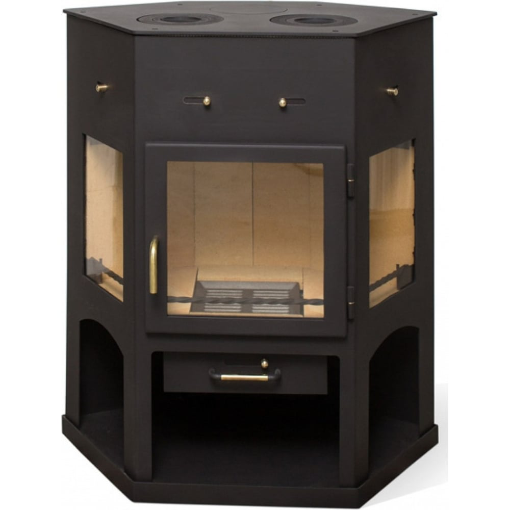 Дополнительные характеристики: Мощная пристенная печь с большим панорамным обзором. Большая плоская дверка по центру и два боковых стекла дают максимально возможный обзор горения в большой топке. Идеально подходит для обогрева помещения площадью 55-110 м2. Верхняя крышка изготовлена их стали толщиной 10 мм и укомплектована 2 чугунными конфорками. Подсоединение к дымоходу сверху или сзади.