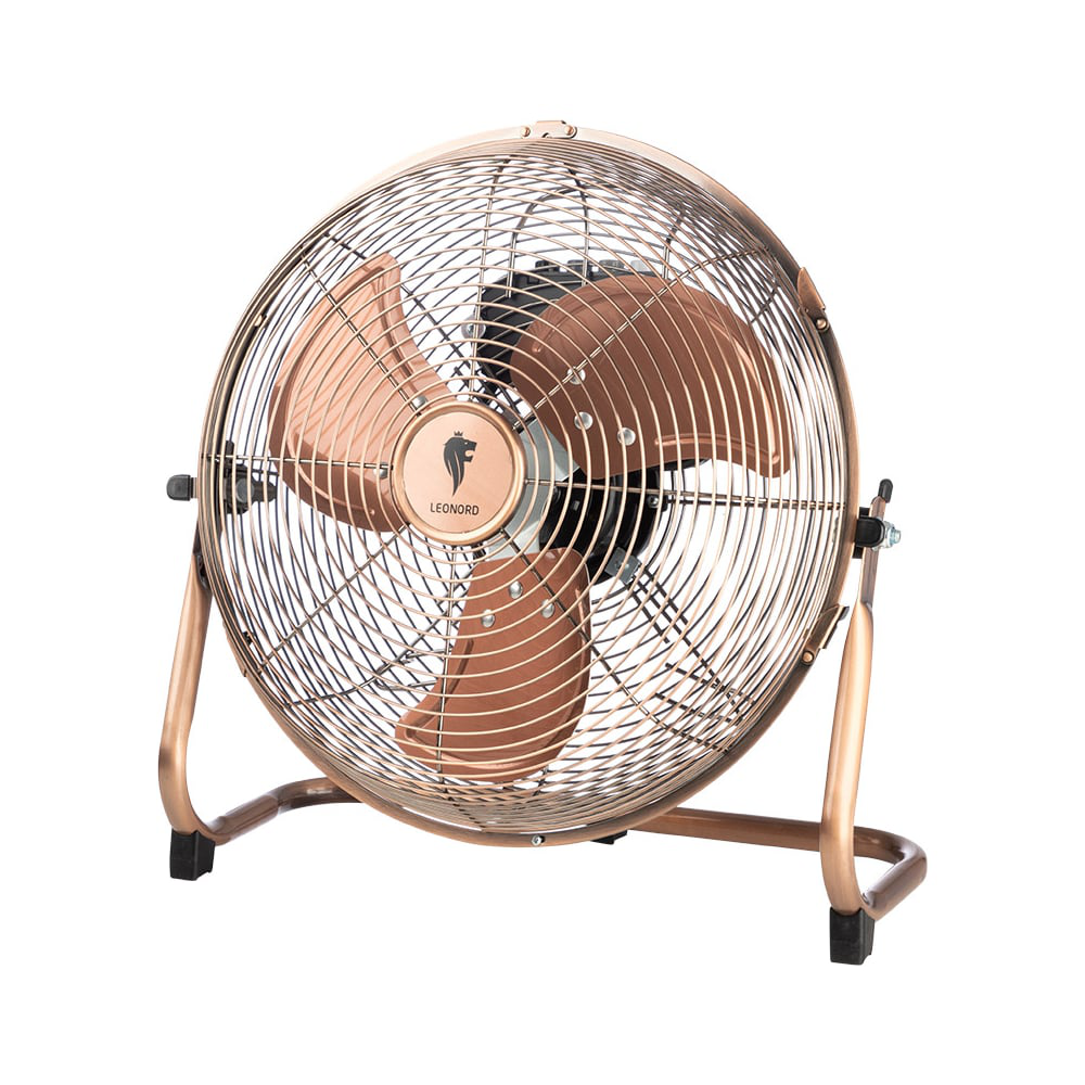 Вентилятор Leonord LE-1604 1шт/коробка. Мощность 45Вт. Металлический корпус. Алюминиевые лопасти. Современный дизайн. Медный цвет. Диаметр 12". Высота 40 см. 3 скорости. Регулировка наклона. Длина шнура 129 см.
